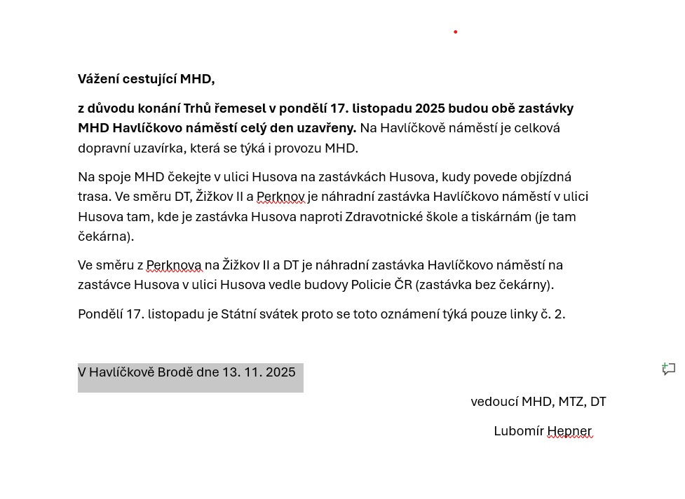 omezení provozu MHD 17.11.2025 - Havlíčkovo náměstí